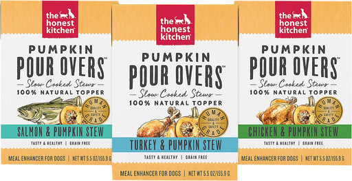 The Honest Kitchen Pumpkin Pour Overs are slow cooked with tasty human grade meats, veggies, tummy-taming pumpkin. These chunky yet pourable stews ...
