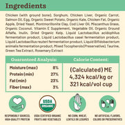 Ingredients: Chicken (with ground bone), Sorghum, Chicken Liver, Organic Carrot, Egg, Organic Sweet Potato, Salmon Oil, Organic Kale, Chicken Fat, Organic Apple, Dried Yeast, Montmorillonite Clay, Miscanthus Grass, Organic Coconut, Cod Liver Oil, Vitamin E Supplement, Vegetable Oil, Organic Ground Alfalfa, Inulin, Dried Organic Kelp, Liquid Lactobacillus acidophilus fermentation product, Liquid Lactobacillus casei fermentation product, Liquid Lactobacillus reuteri fermentation product, Liquid Bifidobacterium animalis fermentation product, Mixed Tocopherols (Preservative), Taurine, Green Tea Extract, Rosemary Extract