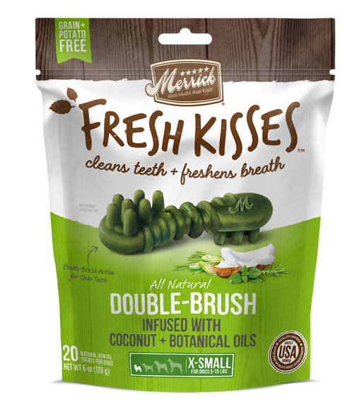 Merrick Fresh Kisses infused with Coconut + Botanical Oils are an innovative, natural dental treat designed not only to clean dogsā teeth, but to t...