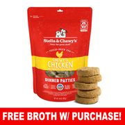 Chewy's Chicken Freeze-Dried Dinner Patties are made of only the good stuff! These patties are made with 95% raw cage-free chicken, nutrient-rich organs and bone, plus organic fruits and vegetables, added vitamins and minerals and probiotics and antioxidants to make a 100% complete and balanced dinner. Patties contain no added hormones or antibiotics, no grains or fillers, no gluten and no artificial preservatives or colorings. Serve as is or rehydrate by adding warm water. Available in 5.5oz, 14oz, or 25oz.