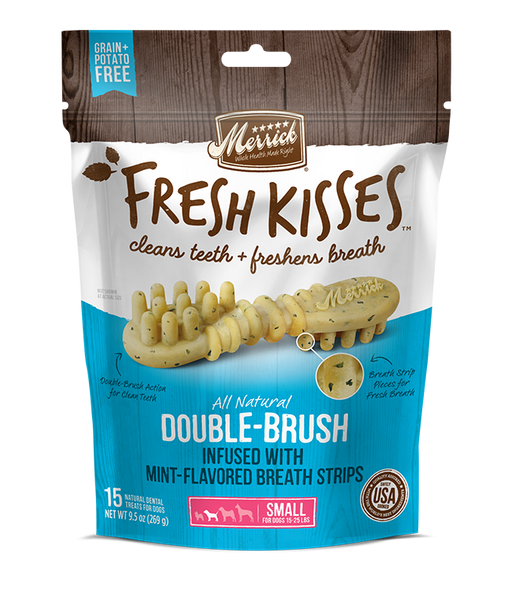 Merrick Fresh Kisses infused with Mint-Flavored Breath Strips are an innovative, natural dental treat designed not only to clean dogs’ teeth, but ...