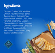 Ingredients: Deboned Chicken, Chicken Meal, Chicken Fat, Brown Rice, Barley, Tapioca Starch, Oatmeal, Peas, Natural Flavor, Brewers Dried Yeast, Pork Fat, Dried Whey, Lecithin, preserved with Citric Acid and Mixed Tocopherols, Dried Cultured Whey, Glucono-Delta-Lactone, Potassium Chloride, Yeast Extract, DL-Methionine, Taurine, Oil of Rosemary.