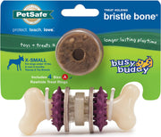 The durable nylon bristles and rubber nubs of the Bristle Bone provide a unique chewing experience. The irresistible, replaceable Gnawhide treat rings ensure long-lasting enjoyment and are easy to replace. The design of the Bristle Bone makes it impossible for dogs to gorge on treats. Toy unscrews to load treats and clean. Comes packed with another set of natural rawhide treats. Additional Gnawhide treat rings sold separately