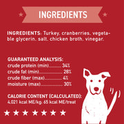 Turkey, cranberries, vegetable glycerin, salt, turkey broth, vinegar.