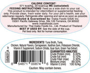 Ingredients: Tuna Broth, Tuna, Chicken, Natural Flavors, Carrageenan, Xanthan Gum, Potassium Chloride, Vitamin E Supplement, Sodium Citrate, Guar Gum, Green Tea Extract.