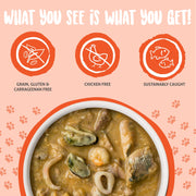 Ingredients: Mackerel Flakes, Water Sufficient For Processing, Calamari, Shrimp, Mussel, Sunflower Seed Oil, Locust Bean, Carrageenan, Dicalcium Phosphate, Guar Gum, Choline Chloride, Taurine, Vitamin E Supplement, Zinc Sulfate, Thiamine Mononitrate (Vitamin B1), Nicotinic Acid (Vitamin B3), Ferrous Sulfate, Calcium Pantothenate, Vitamin A Supplement, Potassium Iodide, Manganese Sulfate, Vitamin D3 Supplement, Copper Sulfate, Riboflavin Supplement (Vitamin B2), Pyridoxine Hydrochloride (Vitamin B6), Folic Acid, Menadione Sodium Bisulfite Complex (Source of Vitamin K), Vitamin B12 Supplement.