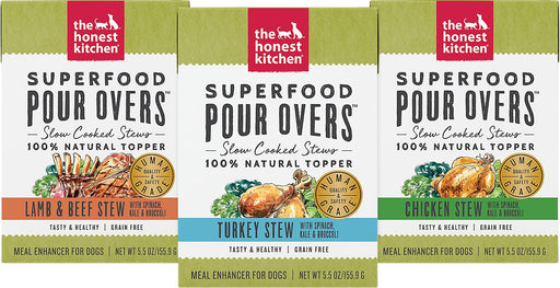 View full detailsThe Honest Kitchen Pumpkin Pour Overs are slow cooked with tasty human grade meats, veggies, tummy-taming pumpkin. These chunky yet pourable stews ...
