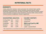 Turkey; Turkey Liver; Tomatoes; Carrots; Green Peas; Rice; Thyme; Turmeric; Parsley; Dicalcium Phosphate; Calcium Carbonate; Potatssium Chloride; Sodium Bicarbonate; Vitamin D3; Magnesium Amino Acid Chelate; Vitamin E; Zinc Amino Acid Chelate; Iron Amino Acid Chelate; Copper Amino Acid Chelate; Potassium Iodide
