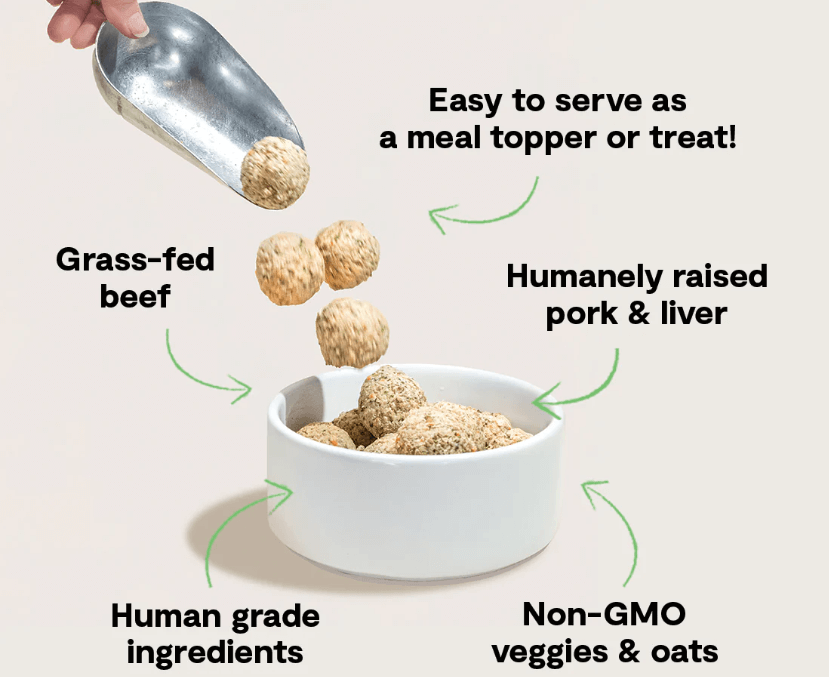 Open Farm's freshly crafted meatball recipe features a mix of humanely raised beef, pork, nutrient rich pork liver and non-GMO veggies – all human-grade ingredients. These meatballs are easy to serve and perfect as a meal, topper or treat! This Freshly Crafted recipe ships frozen to preserve freshness and flavor for longer! Just thaw and serve when you're ready to feed.
