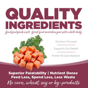 Salmon, salmon meal, oatmeal, barley, brown rice, millet, sunflower oil, flax seed, dried plain beet pulp, kale, dried yeast, natural flavor, dehydrated alfalfa meal, dried tomato pomace, dicalcium phosphate, potassium chloride, calcium carbonate, salt, dried carrots, dried apricots, dried cherries, DL methionine, choline chloride, threonine, minerals (zinc proteinate, iron proteinate, selenium yeast, copper proteinate, magnesium proteinate, manganese proteinate, ethylenediamine dihydroiodide), inulin, brewers dried yeast, taurine, turmeric, vitamins (vitamin E supplement, niacin supplement, vitamin A supplement, thiamine mononitrate, d-calcium pantothenate, pyridoxine hydrochloride, riboflavin supplement, biotin, vitamin B12 supplement, folic acid, vitamin D3 supplement), hydrolyzed yeast, L-ascorbyl-2-polyphosphate (source of vitamin C), lactic acid, tocopherols (a preservative), yucca schidigera extract, yeast culture, dried Aspergillus oryzae fermentation extract, dried Bacillus subtilis fermentation product, dried Bacillus licheniformis fermentation product, dried Trichoderma longibrachiatum fermentation extract, dried Enterococcus faecium fermentation product, dried Lactobacillus acidophilus fermentation product, dried Bacillus subtilis fermentation extract, citric acid (a preservative), L-carnitine, rosemary extract.